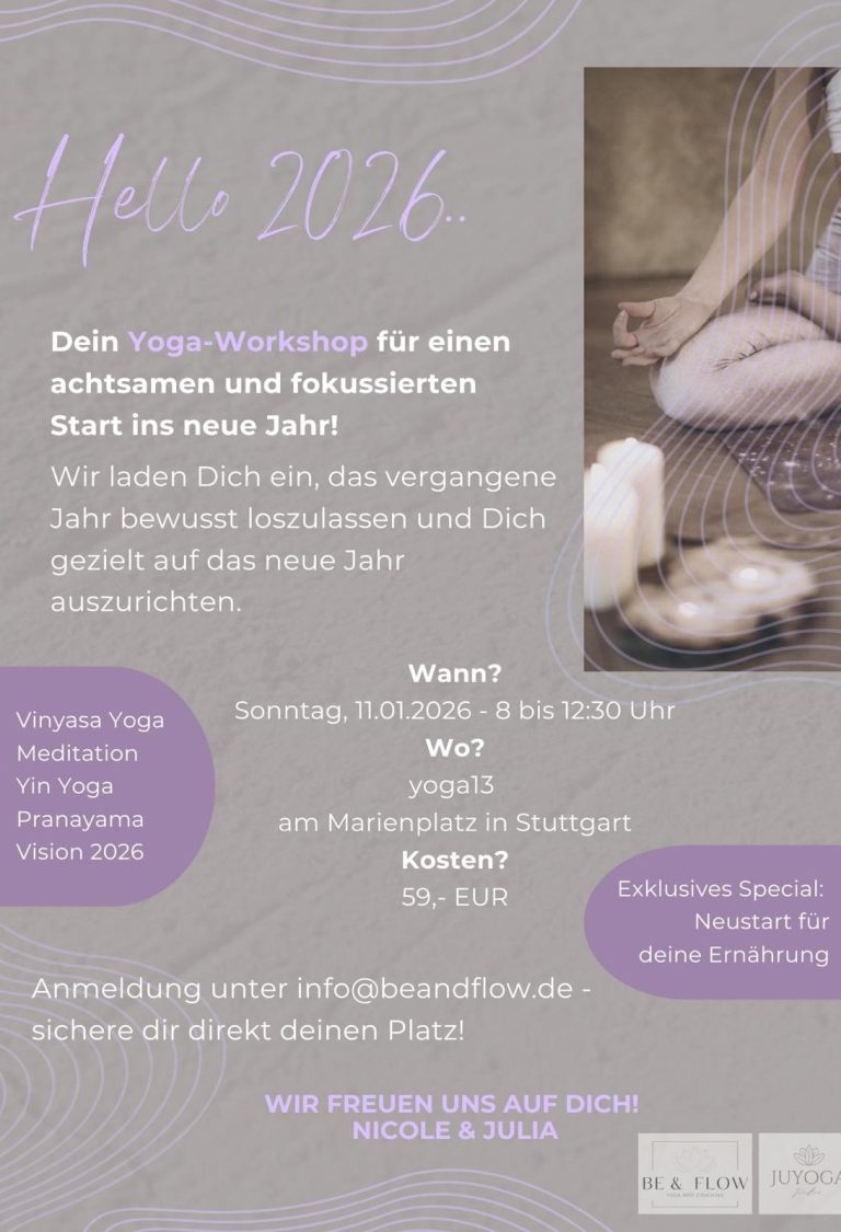 Nimm dir für deinen Neustart ins Jahr 2026 Zeit nur für dich. Wir fließen gemeinsam durch eine inspirierende Meditation, gefolgt von einer ruhigen Yin-Yoga Einheit zum Start in den Tag. Inspiriert von neuen Impulsen zur Neuausrichtung deiner Ernährungsgewohnheiten, kannst du deine Gedanken und Ziele für das nächste Jahr visualisieren & dein eigenes Vision Board kreieren. Mit einem verspielten und kraftvollen Vinyasa Yoga Flow wird dein Workshop abgerundet.